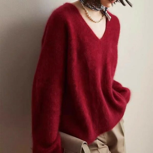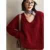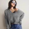 毛衣採用V領剪裁,巧妙拉長頸部線條,增添女性優雅氣質。搭配寬鬆版型,既舒適又不失造型感,讓穿著者輕鬆展現慵懶時尚風格。