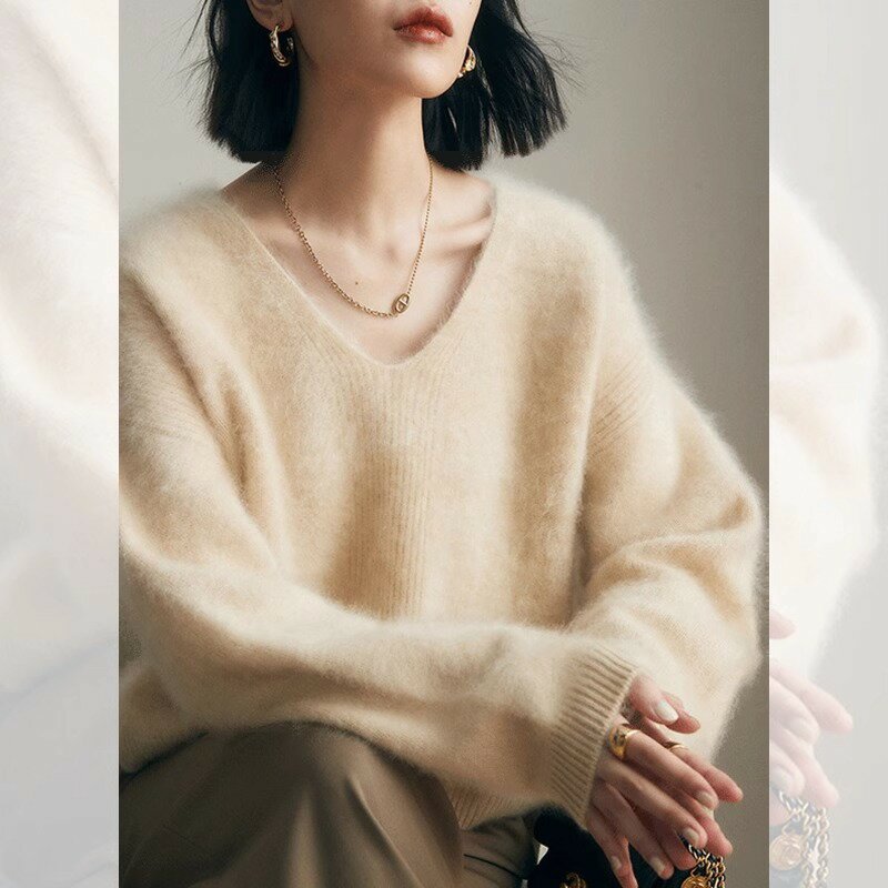 毛衣採用V領剪裁,巧妙拉長頸部線條,增添女性優雅氣質。搭配寬鬆版型,既舒適又不失造型感,讓穿著者輕鬆展現慵懶時尚風格。