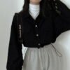 前襟或下擺抽繩設計,不僅增加造型層次,還能根據個人喜好調整鬆緊,打造自然蓬鬆或收腰造型。搭配高腰褲或裙裝,都能展現韓系隨性風格與比例感。