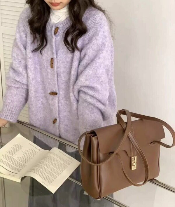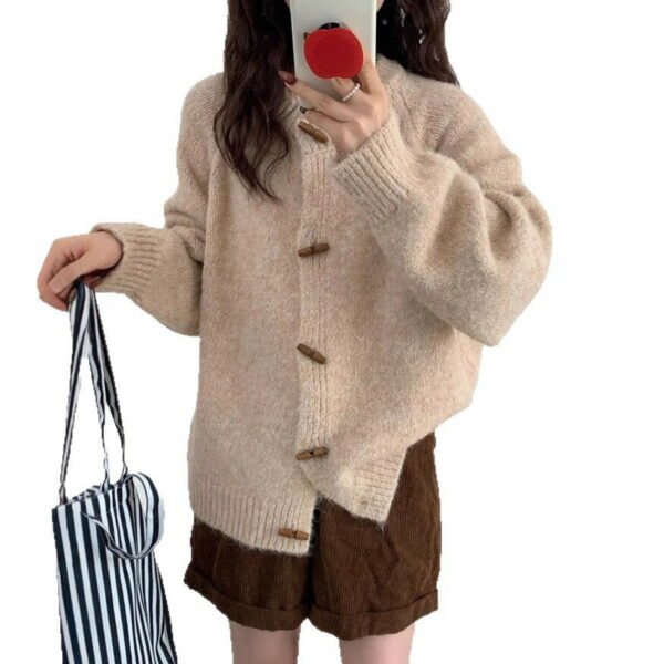 ✨ 韓系復古.溫柔學院風 融合韓系簡約與經典復古元素,吸睛的 「牛角釦」 設計是整體亮點,為素色外套增添了滿滿的 「學院風」 與減齡感。隨意披上,立刻展現如韓妞般的溫柔氣質。