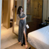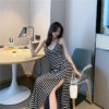 新款吊帶小黑裙性感溫柔v領打底復古長側開腳黑色洋裝女新款吊帶小黑裙性感溫柔v領打底復古長側開腳黑色洋裝女