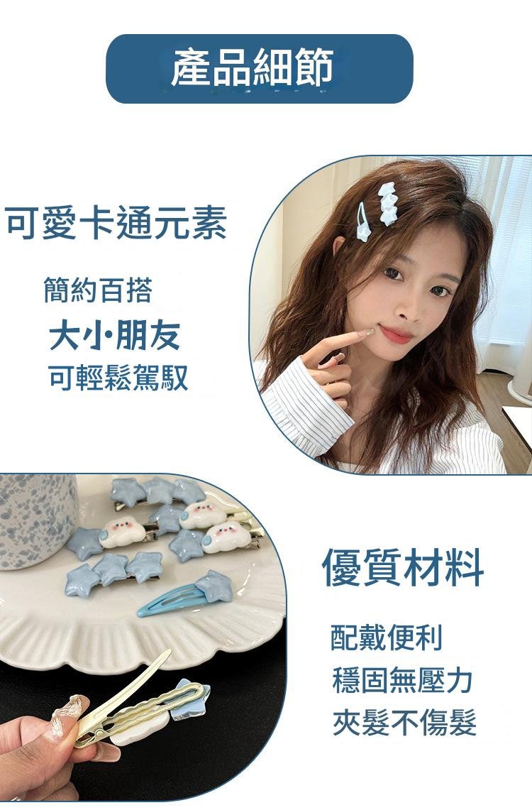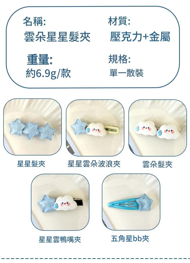 這款可愛雲朵星星髮夾以夢幻雲朵和閃亮星星為設計元素,帶來浪漫又童趣的氣息。佩戴後立即提升整體造型的可愛感與少女感,適合拍照、約會或日常穿搭。